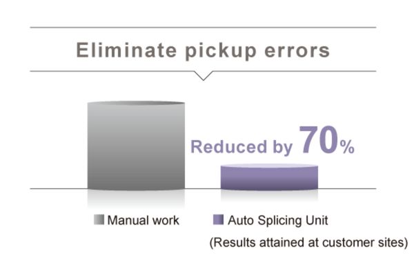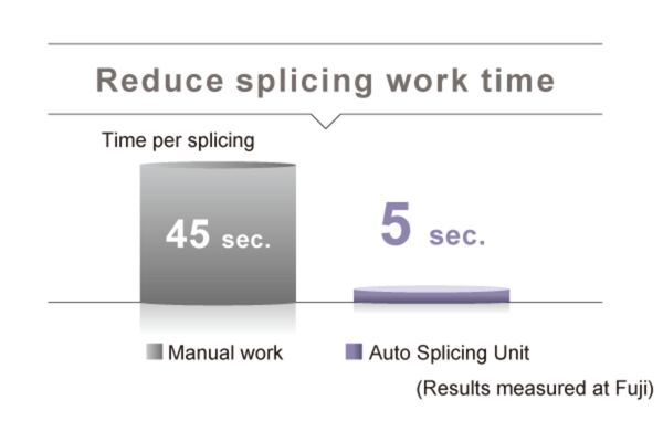 Just by inserting the old and new tapes from both side of the unit, tape is automatically taken up and splicing is performed. Splicing quality becomes stable because the unit automatically detects the appropriate cutting position and then cuts and connects tapes. In addition, it is not necessary to set tape to a dedicated jig and the work time can be reduced significantly.