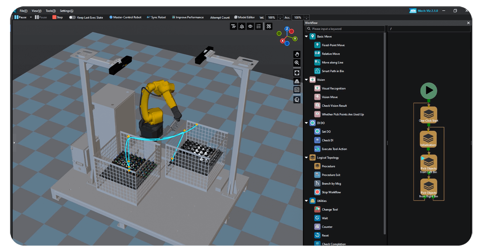 Different from the traditional code-based programming software, Mech-Viz is a graphical robot programming software.