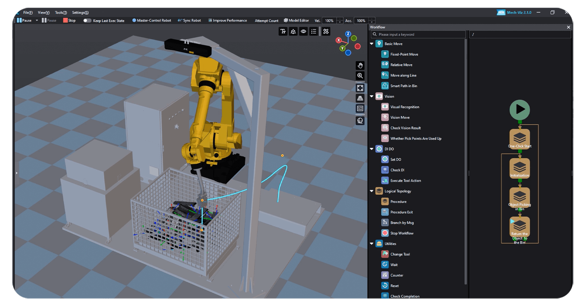 Different from the traditional code-based programming software, Mech-Viz is a graphical robot programming software.