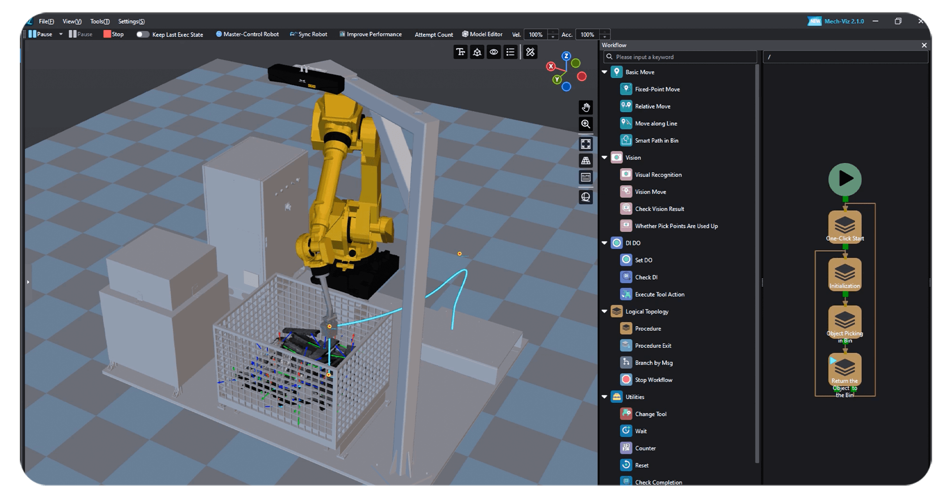 Different from traditional code-based programming software, Mech-Viz is a graphical and visual programming software.