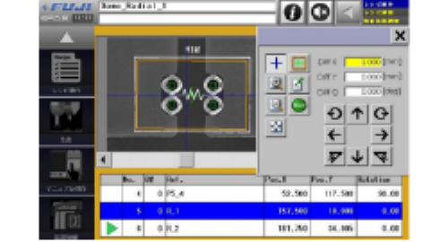 There are some cases in which the size of the actual panel on which parts are to be inserted is different from the dimensions in the drawing. Because of this, the machine has functions for finely adjusting the insertion position. This is done by checking the actual insertion positions at the control panel.