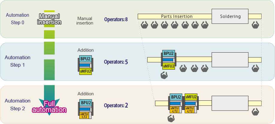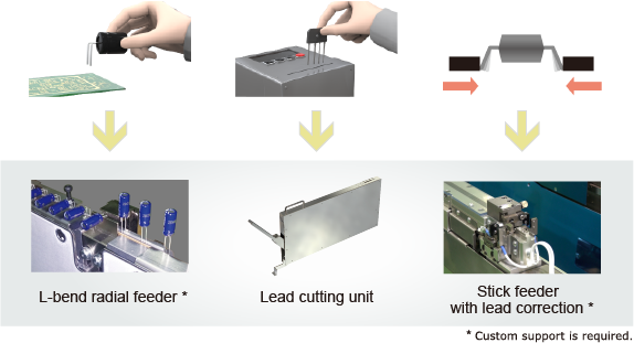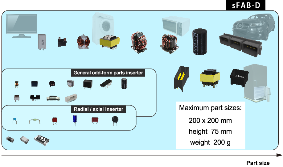 sFAB-D, the multi-purpose automated fabrication machine, flexibly supports various part sizes, shapes, and supply packages, from leaded parts to large odd-form parts, and automates insertion processes that are performed manually, providing stable quality and production.