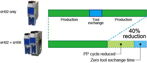 For example, when using the combination of an sH02 head and H08 head, the production time can be reduced by 40% (*) compared with production using an sH02 head only. (*Fuji internal investigation)