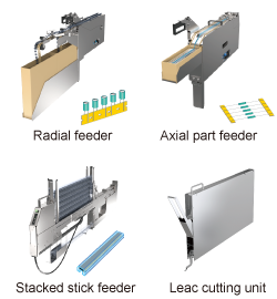 Feeders It is possible to set up to 32 radial feeders (16 x 2 on each side) when the machine has an sMFU-SH and a fixed feeder pallet. It is also possible to support parts supplied in sticks and parts supplied in axial tape. Previous processes such as lead cutting are also automated.