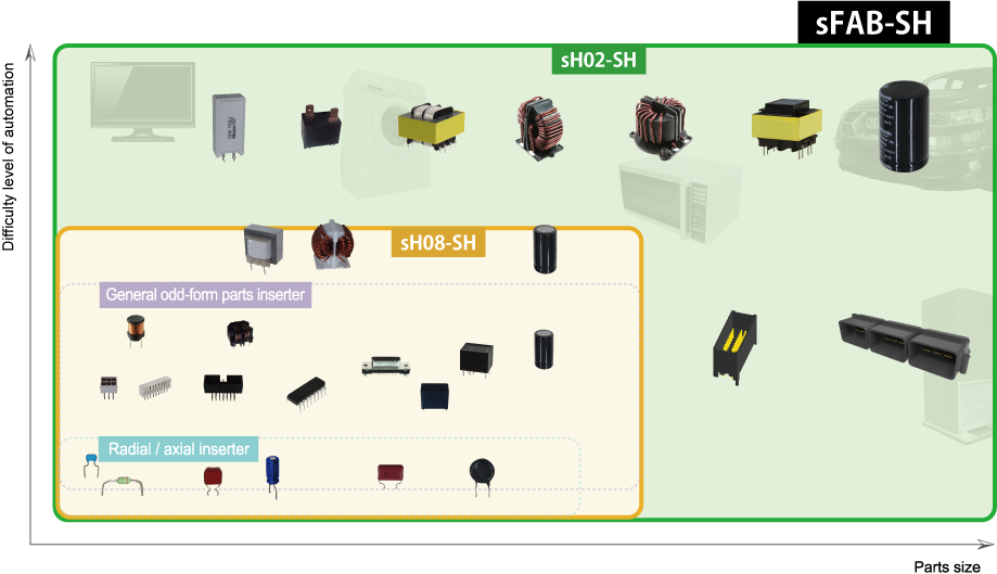 Supports high-speed handling of small parts up to 39.5 mm tall and 20 g in weight - sH08-SH head Performs high-speed insertions by transporting up to eight parts at once. Optimum for parts such as axial parts, radial parts, connectors, buzzers, and compact transformers.